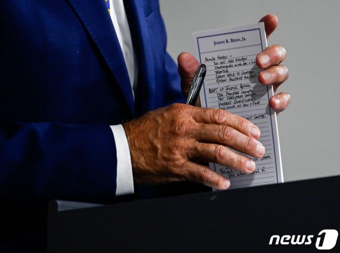 관심은 바이든 후보가 들고 있던 메모지에 쏠렸다. 파란색 줄이 그어진 메모장으로, 바이든은 자신이 발언할 내용을 자필로 메모해 놓았다.