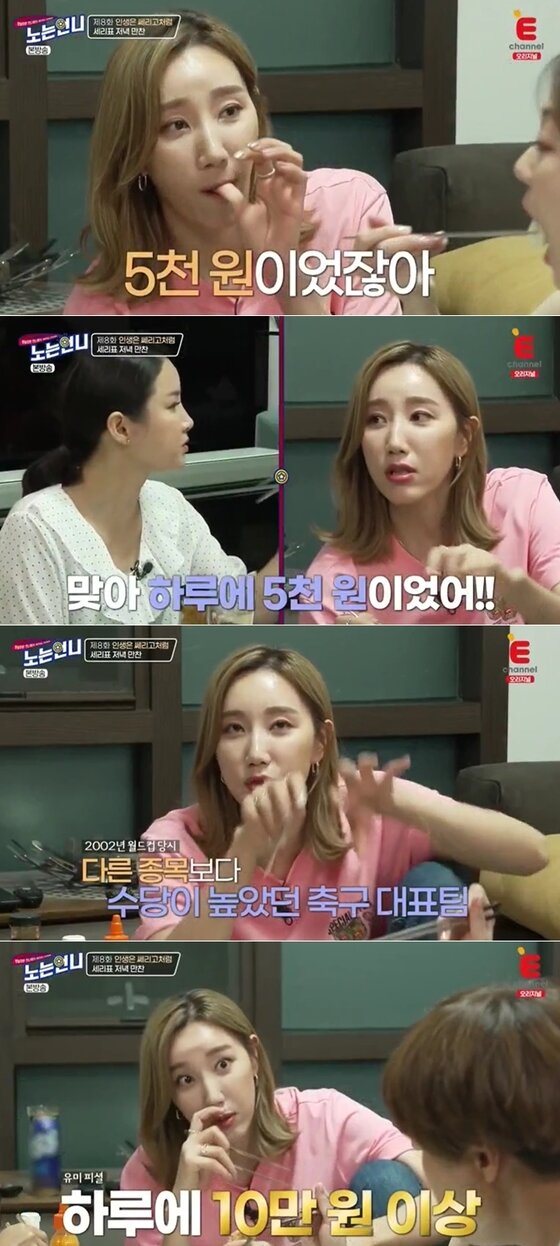 한편 정유인은 "전지훈련의 경우에는 일주일을 꽉 채워서 나오기 때문에 그럴 경우 한달에 130만원 넘게 받기도 했다"라고 설명했다. 이에 한유미는 "나는 30만~40만원이었다"라며 쓴웃음을 지었고, 남현희는 "5000원일 때 한달에 12만8000원이 나왔다"라며 한유미에게 동병상련의 메시지를 보냈다.